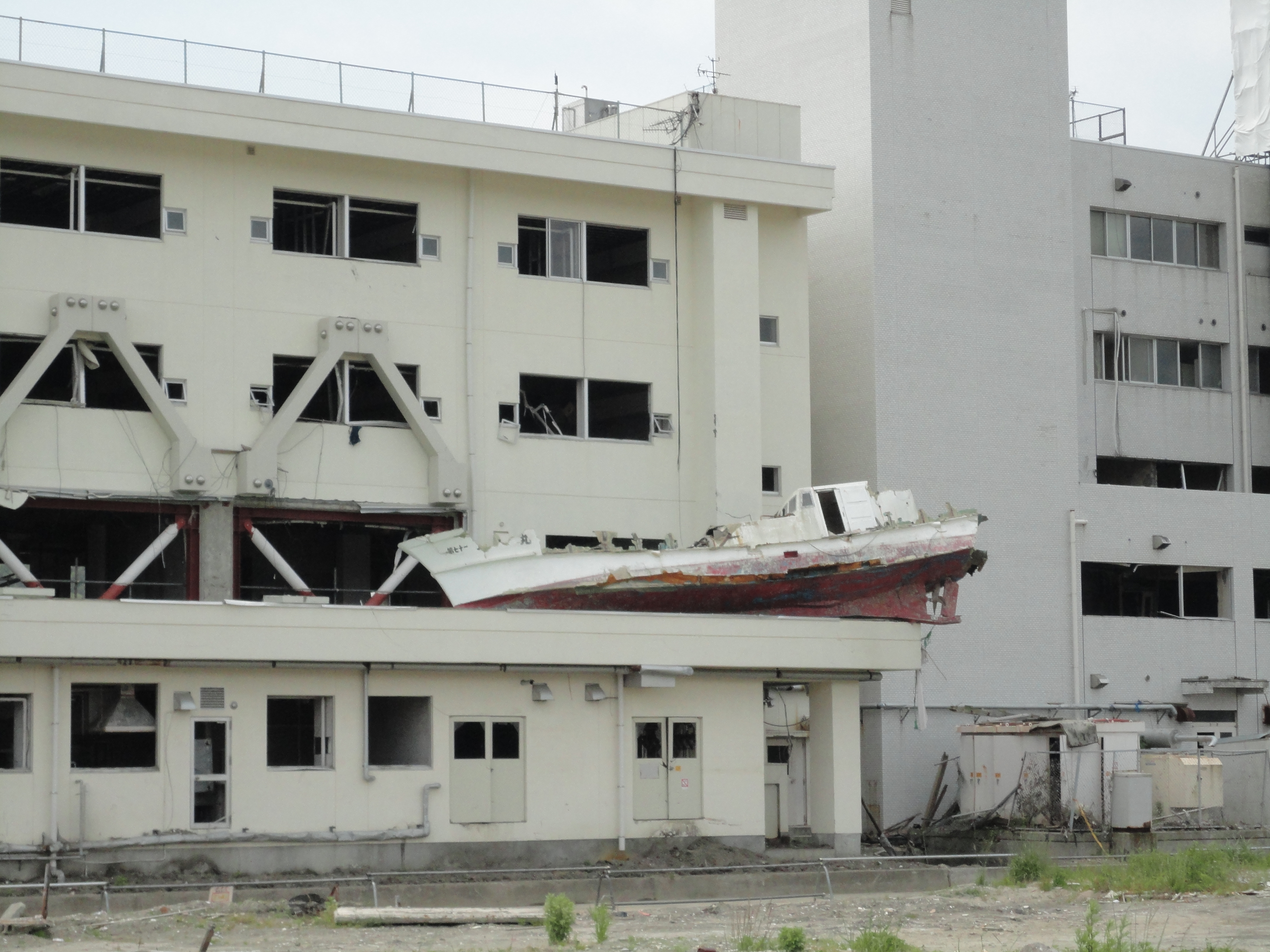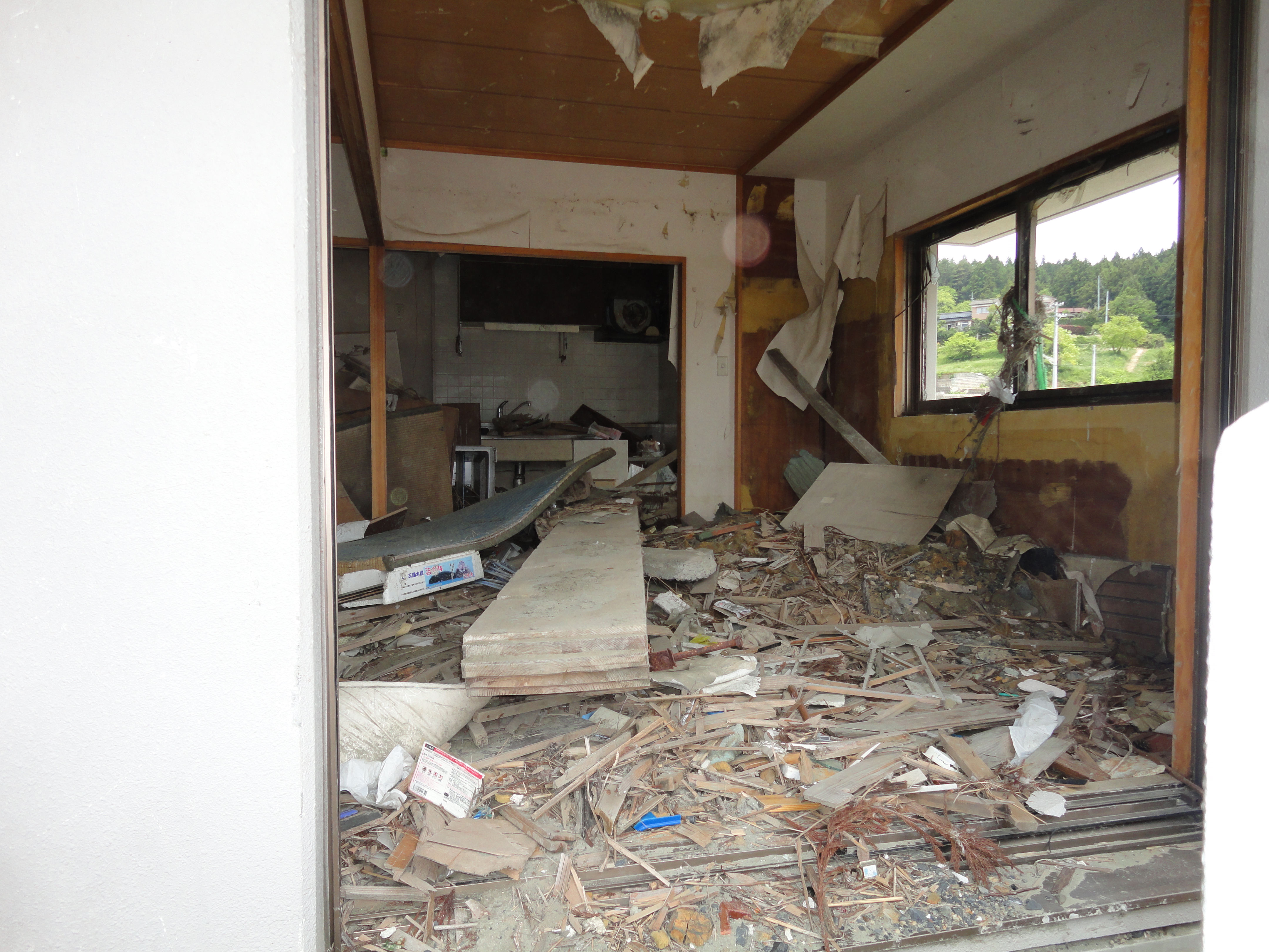 津波によって流されて来たものがまだ片付かず、屋根の上や、室内に残ったままになっています。