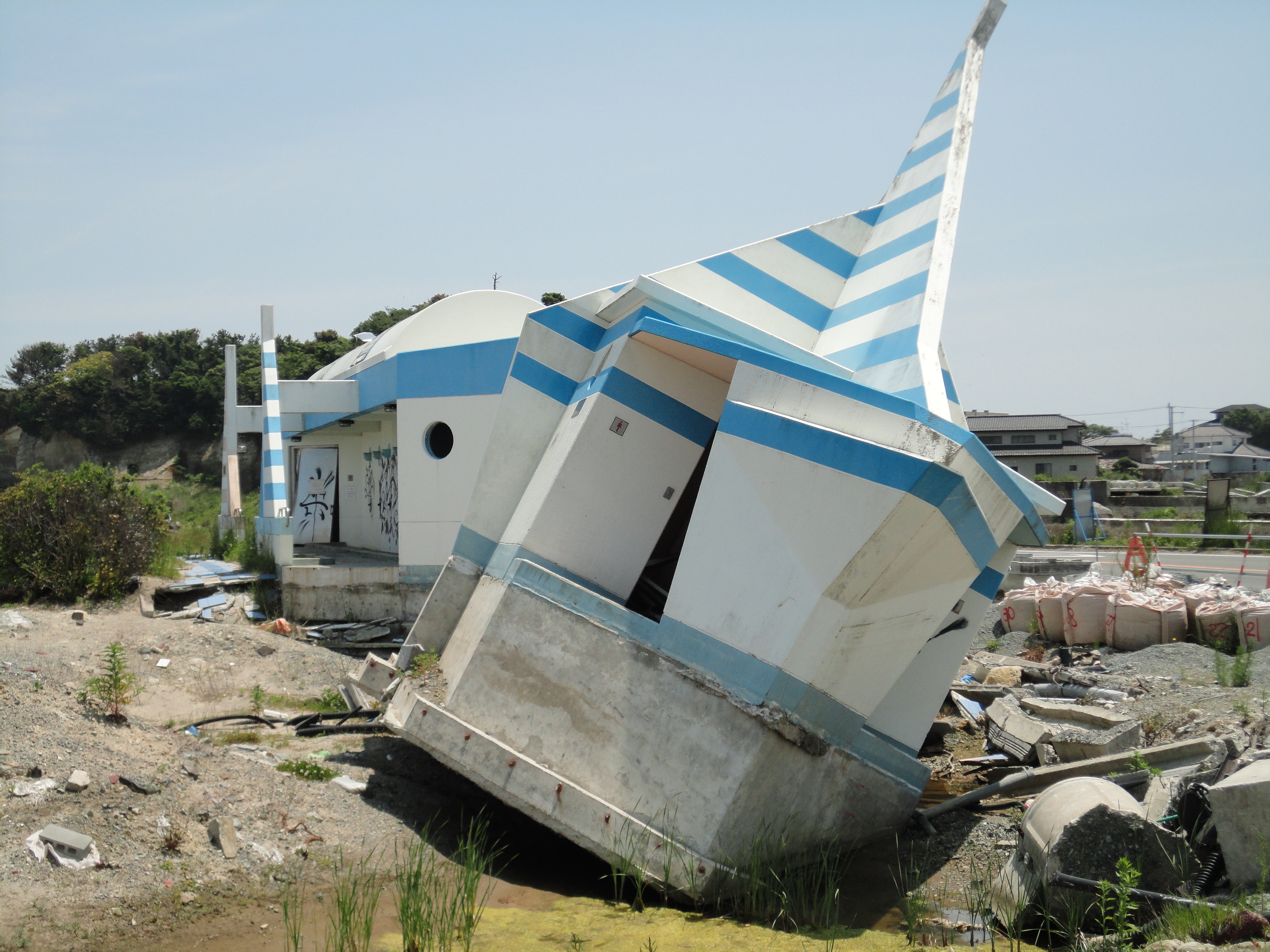 船が建物の屋根に上がってしまっています。